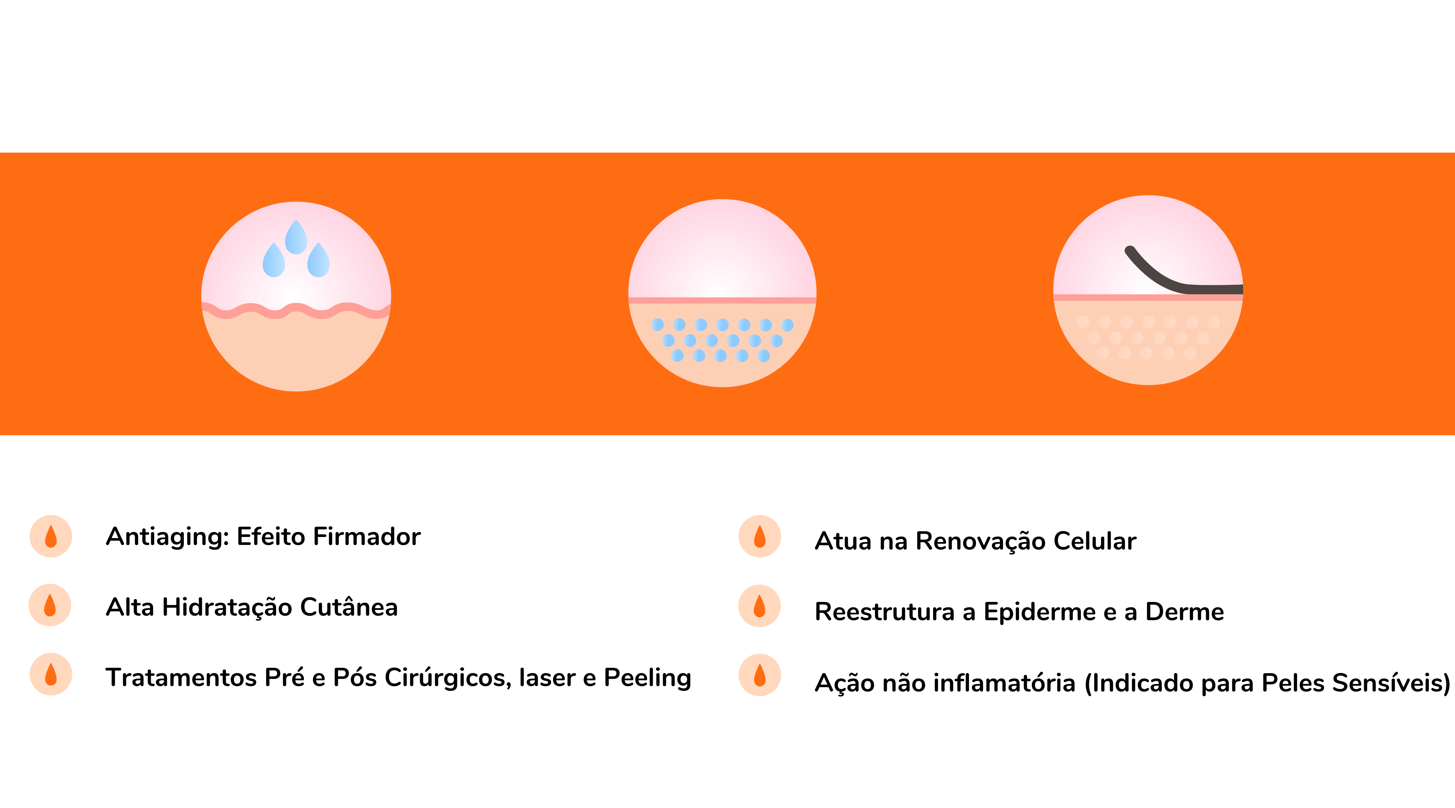 O ácido hialurônico (AH) é um polissacarídeo que melhora a hidratação da pele e estimula a síntese de colágeno e elastina, promovendo espessura, firmeza e elasticidade.
