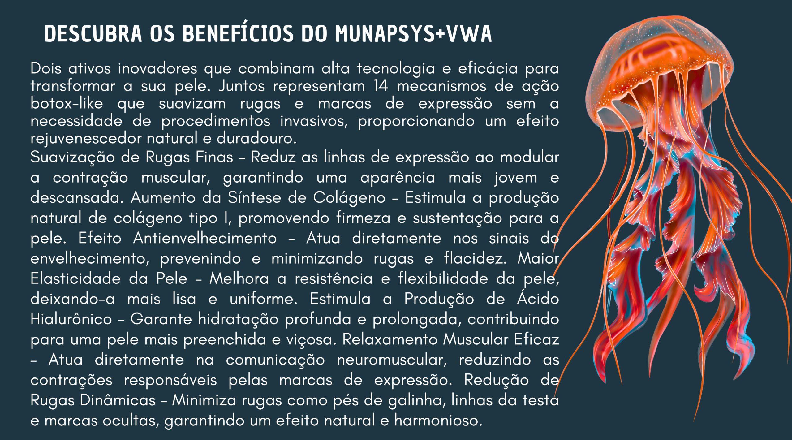 A combinação do V/WA com Munapsys potencializa os benefícios antienvelhecimento, uma vez que ambos atuam na comunicação neuromuscular, mas com abordagens complementares. Enquanto o V/WA